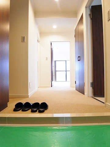 玄関はブラックの床材が使われ、落ち着いた印象。左手には姿見付きの大きなシューズボックスが設置されているので、玄関に靴があふれることはなく綺麗に保つことが出来ます。