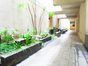 正面の階段を降りて共有廊下への2次セキュリティーを抜けます。吹抜けから沢山の光が入り、とっても明るい空間になっていますよ。