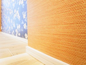伸びた空間の奥は、ネイビーのお花柄のクロス✿ 階段とはまた違った雰囲気で落ち着いた印象です。
