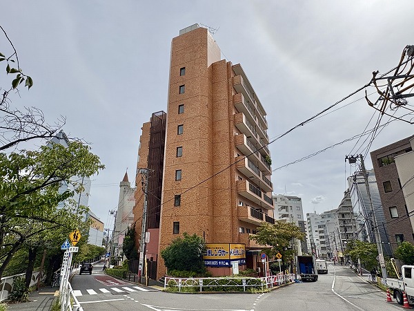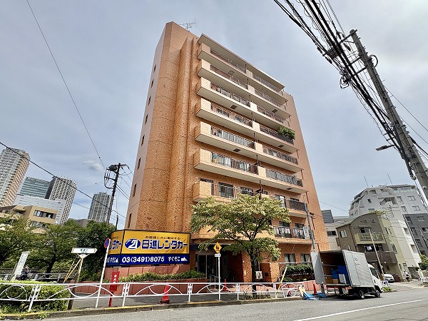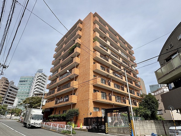オレンジ色のタイル貼りが目を惹く、レトロな外観の『ハイホーム目黒』。入り口は目黒川とは逆側に位置しています。総戸数44戸の9階建てマンション。