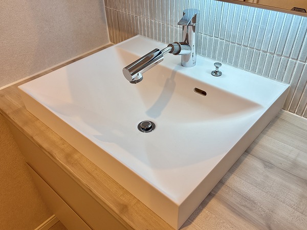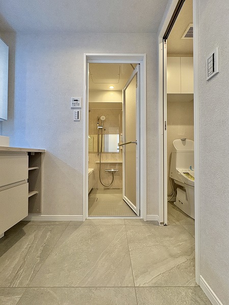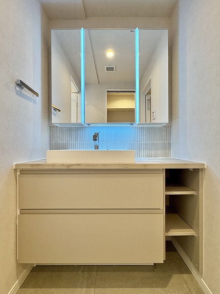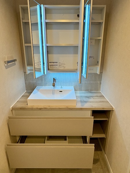 サニタリールームには洗面化粧台・トイレ・バスルームがまとまっています。水回りの機能が集結しているので、家事動線もスムーズ。洗面化粧台には、人気の3面鏡が採用されていました。