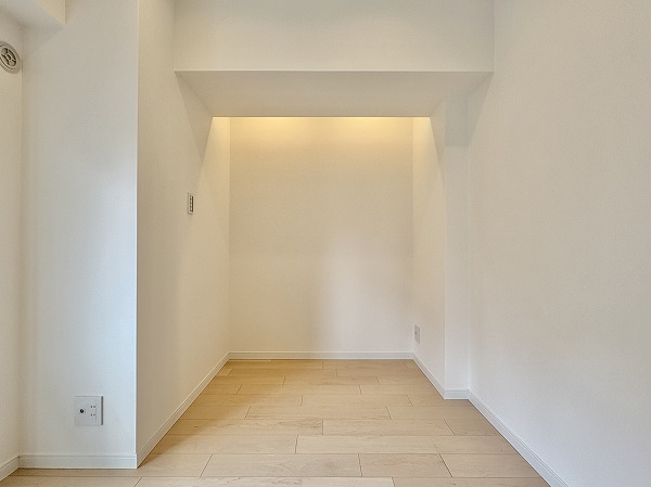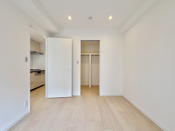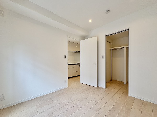 リビングのお隣には、おおよそ5.3帖の洋室があります。奥には大容量サイズのウォークスルークローゼットも備わっていました。季節もののコートやかさばりやすいダウンジャケットなども綺麗に保管できる、便利なスペース。