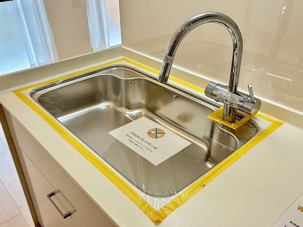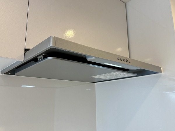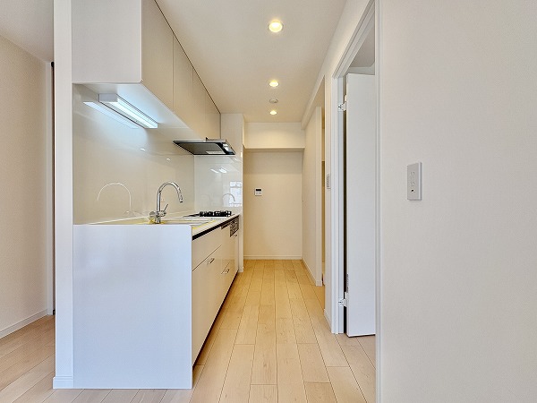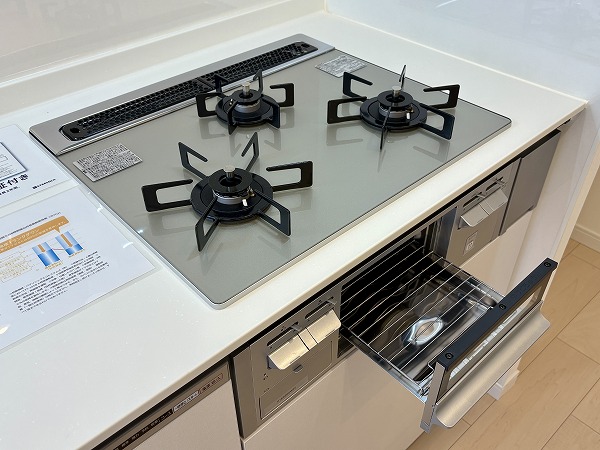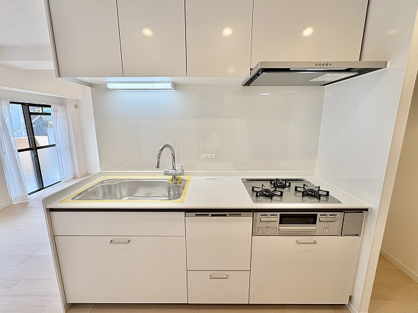 調理に集中できる、壁付タイプのシステムキッチン。白を基調とした清潔感のあるデザインで、使い勝手良好。複数品の同時調理が可能なグリル付き3口コンロ、便利な食洗機や浄水器も備わっています。