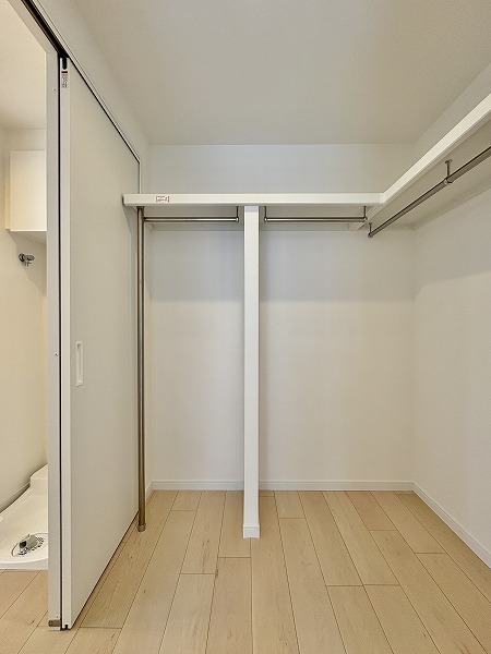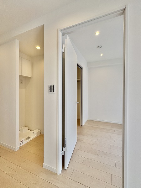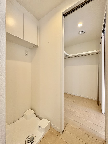 ウォークスルータイプの収納スペースからは、ランドリースペース、そしてキッチンスペースに繋がります。生活動線が良く、朝の身支度などもスムーズに行えそう♪