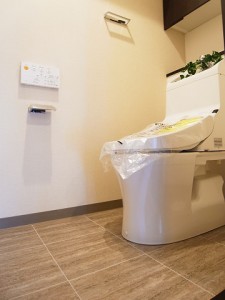 玄関上がって最初に現れるのはトイレ。花や芳香剤などはカウンターに、ペーパーのストックなどは吊戸棚に収納可能です。