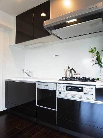 お部屋全体が見渡せる、対面式のシステムキッチン(∩´∀`)∩3口コンロに大きなシンクが採用されていて、お料理もはかどりそう♬面倒な食器洗いは食洗器にお任せ下さい♡