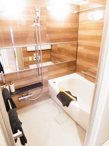 追い焚きと換気乾燥暖房機能完備のバスルームは、木目調パネルでラグジュアリーな雰囲気。ゆったりとした広さが確保され、手や脚を伸ばして寛ぐことが可能です♡