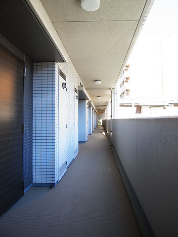 明るい陽射しの射し込む外廊下を通ってお部屋まで♪