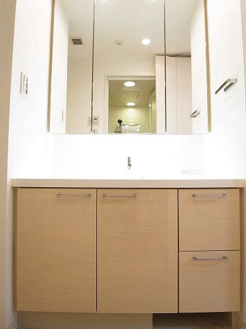 洗面台はスタイリッシュなスクエア型の段差のないものでお手入れも楽にできます♪収納が三面鏡の裏と足元に備わっているので、分けてしまえて便利です。