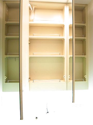 凹凸のあるクロスが特徴の洗面台(´∀`)明るい照明と深い洗面ボウルが、朝の忙しい身支度の際に役立ちます。小物などは鏡裏と洗面ボウル下のキャビネットにたっぷり収納可能です。